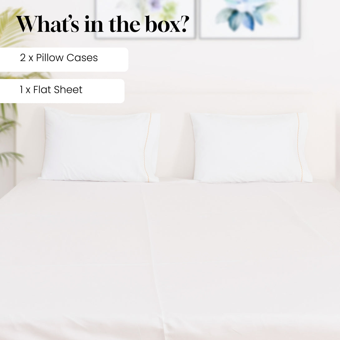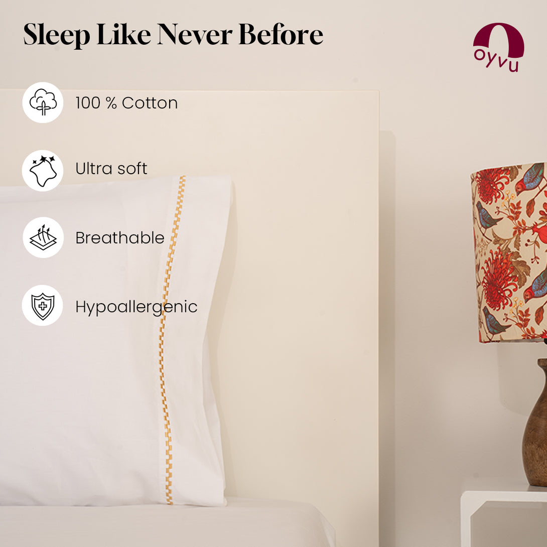 Experience the crisp, cool comfort of classic percale with our 300-thread count, 100% cotton bedsheet set. Crafted from high-quality, all-natural cotton, this set features a smooth, durable, breathable percale weave that offers a soft, matte finish and an invitingly fresh feel—perfect for those who love a clean, crisp bed every night. What truly sets this set apart is the elegant gold flange design on the pillowcases.