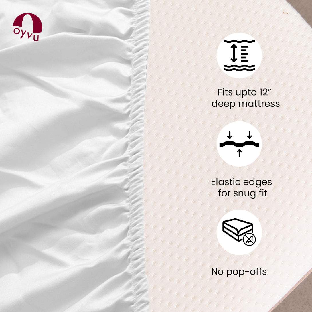 Subtle yet sophisticated, the gold flange detailing adds a touch of texture and refinement to the overall aesthetic, elevating your bedroom with a timeless, tailored look. Perfect for those who appreciate understated elegance and superior comfort, this 300-thread count cotton percale sheet set with embellished pillowcases will quickly become a favourite. The Fitted Sheet comes with a 12" drop that fits up to an 11" mattress, with all-around elastic for a secure and snug fit.